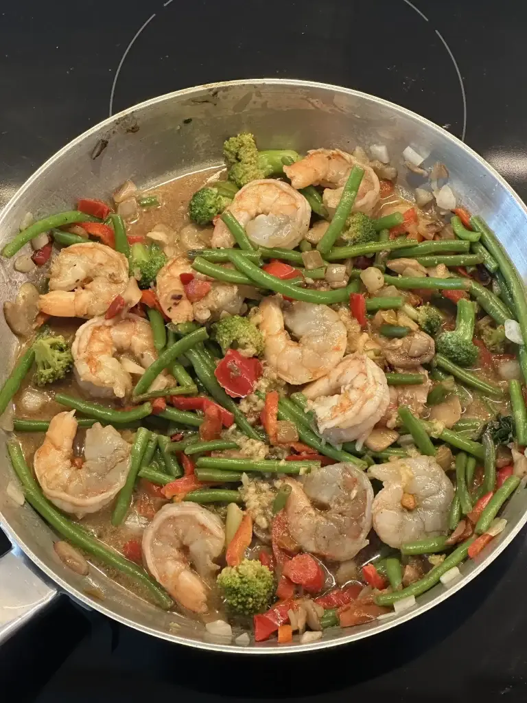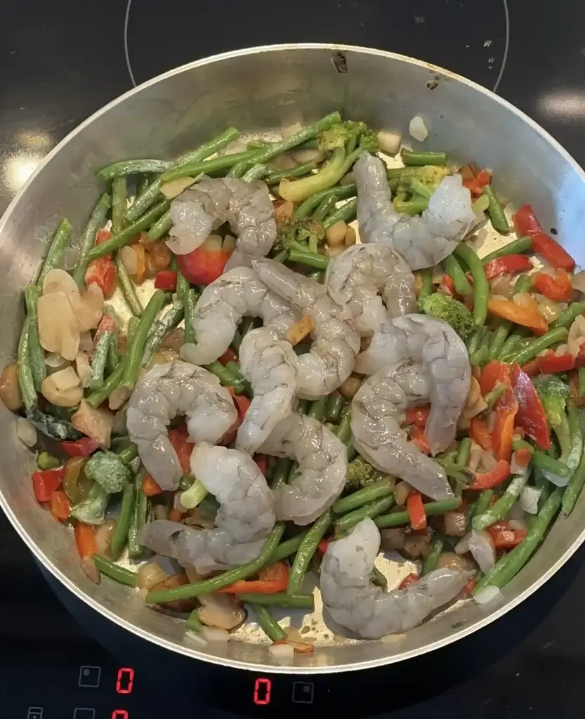 • Step 6: Continue to cook and stir until the vegetables and shrimp are coated and the sauce is thickened, about 5 minutes more.