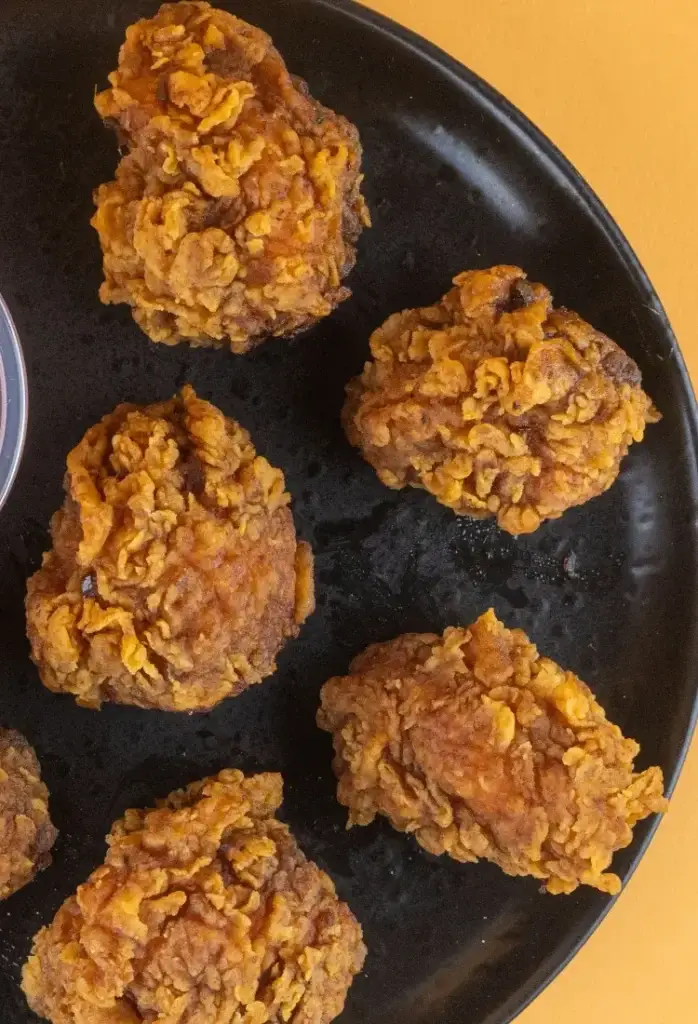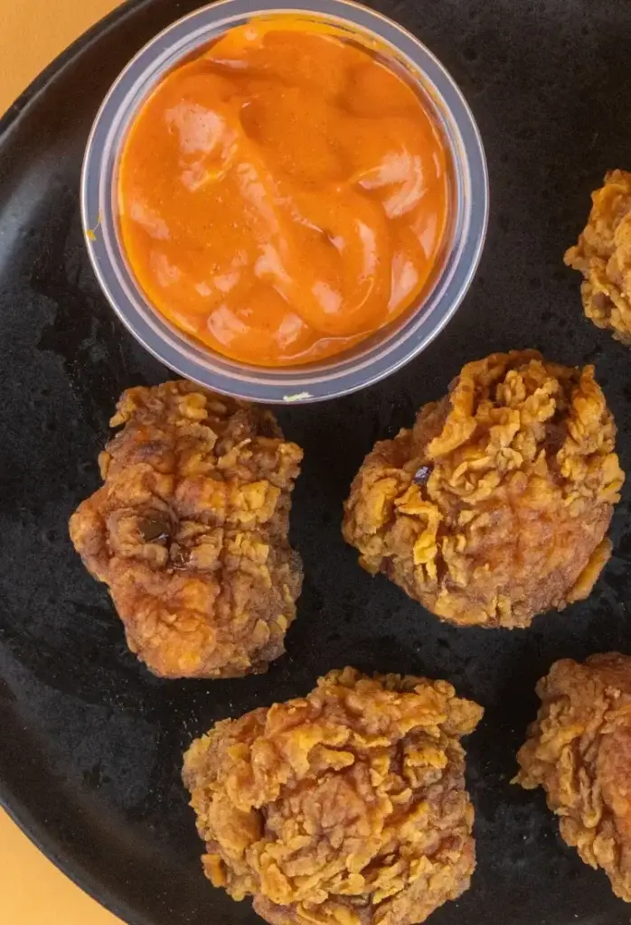 hourCrispy and spicy chicken bites coated in a flavorful seasoning, served with a spicy sauce. Perfect for a tasty appetizer or snack.