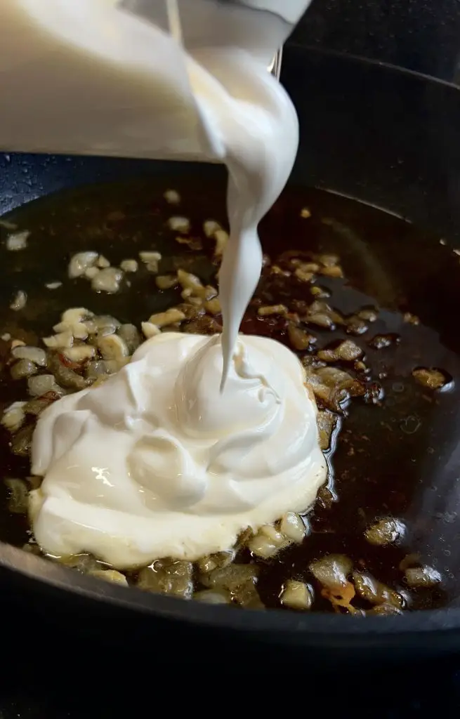 - Lower the heat and stir in the cream. Let it cook for about 5 minutes until it thickens. If it’s too thin, You can mix a little flour with water and add it to the sauce.