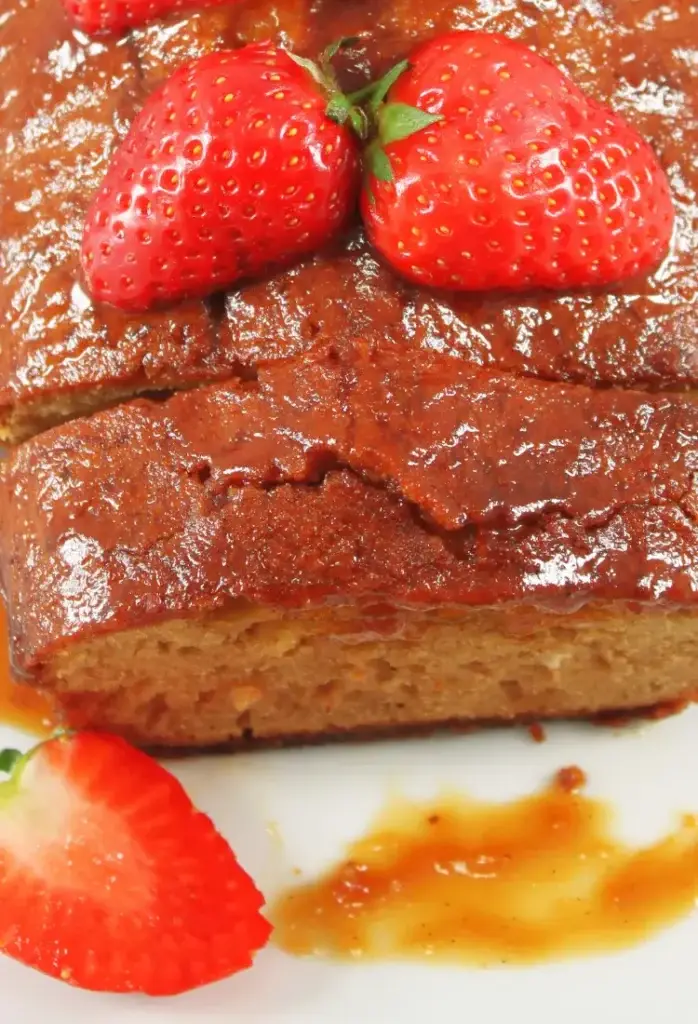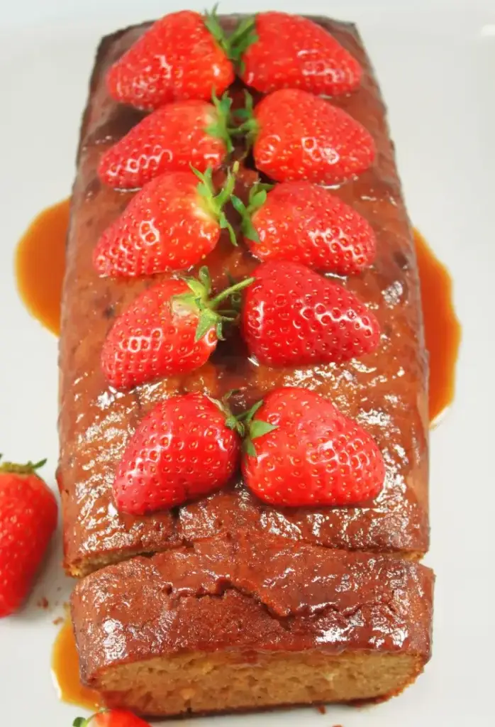 What I like the most about this Strawberry Caramel Cake is the decoration I add each time. This time, I put slices of strawberries in a road shape because I used a loaf pan for the cake. You can use any pan you like, such as a round one, but I think this shape looks so good and adds a special touch to my table.